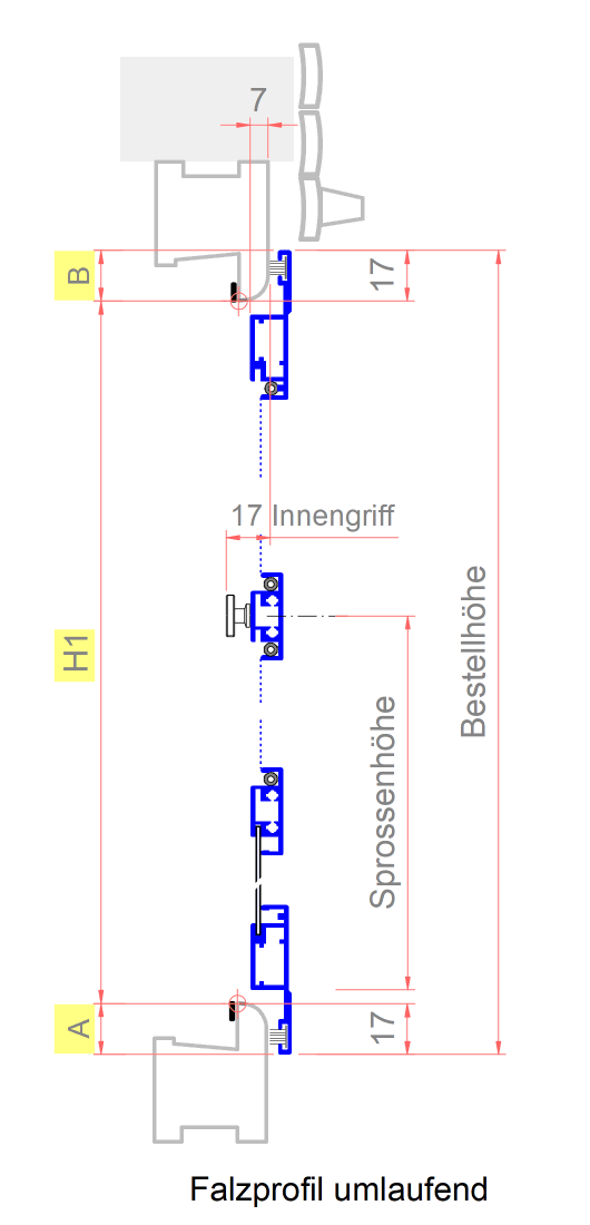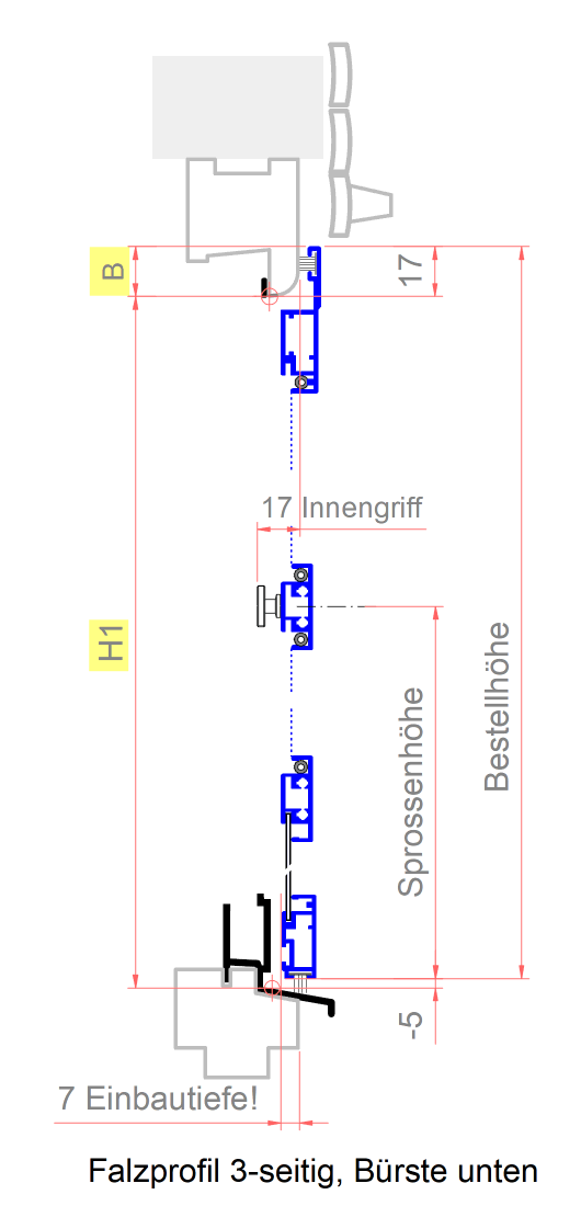 Falls das Maß R (Freiraum bis Rolladenkante) weniger als 1,7 cm beträgt, muss die Höhe entsprechend reduziert werden!