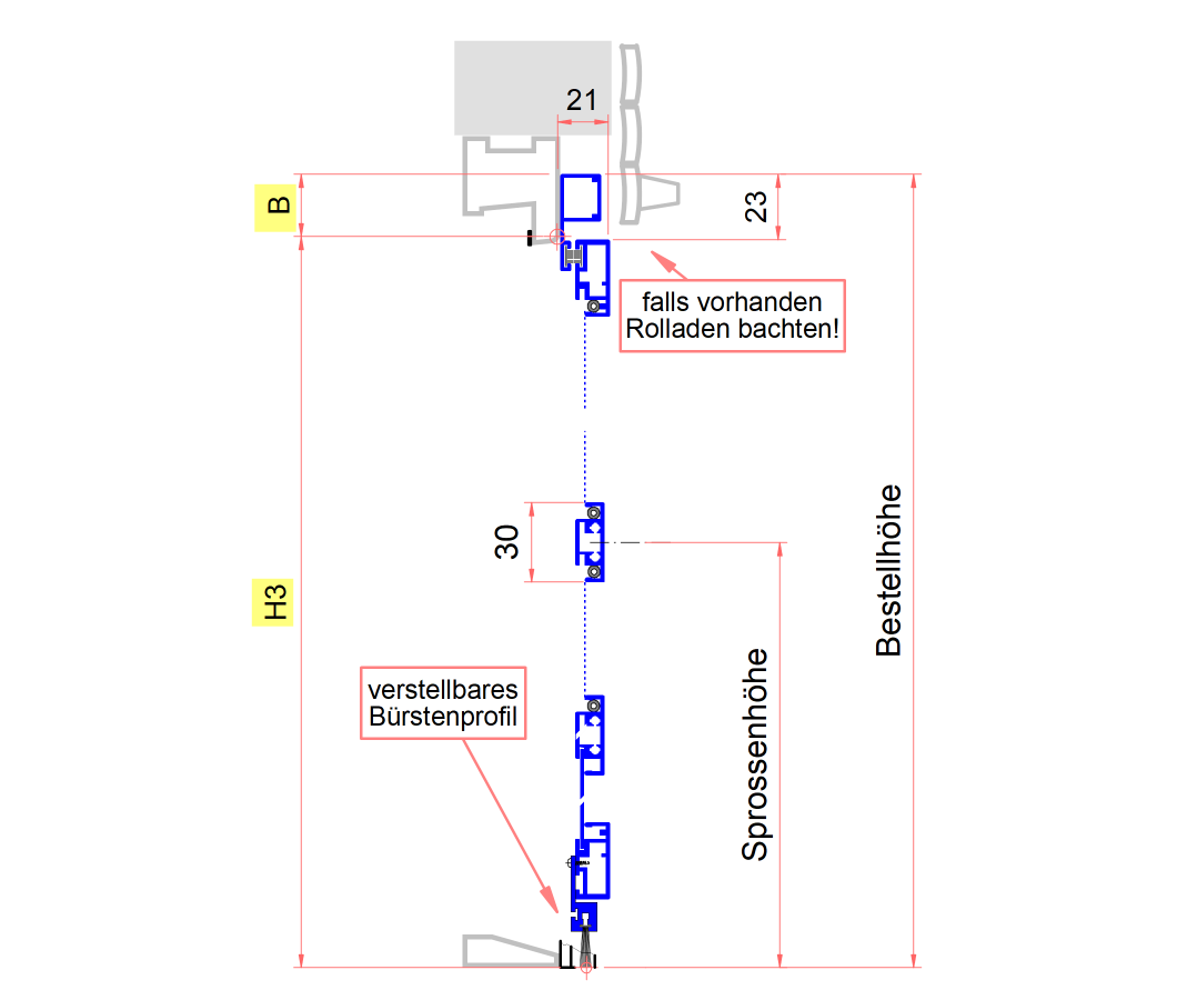 H3 + B = Bestellmaß Höhe (Türrahmenmontage)