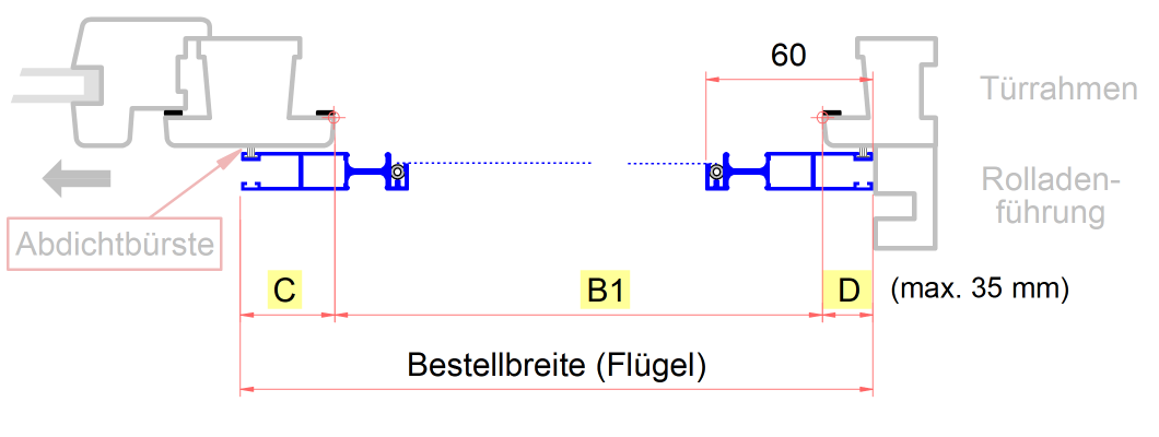 Ansonsten kann auf ein flaches Drehtür-oder Pendeltürsystem zurückgegriffen werden, oder es muss eine Doppelschiebetür außen vor dem Rolladen eingebaut werden.