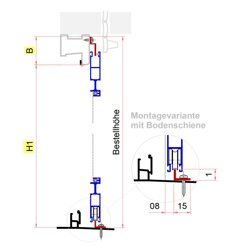 Maß-Bausatz, Rahmenprofile Aluminium 60 x 13,5 mm, mit durchgehender Griffmulde innen und außen. Führungsschienen 26 x 9 mm, optional Boden-Winkelschiene 15 mm breit, 10 mm hoch. Laufrollen mit Edelstahl-Kugellagern, austauschbar, Aushängesicherung mit Hex-Schlüssel entriegelbar. Rahmen auf Gehrung mit Eckverschraubungen, Gewebe nach Wahl