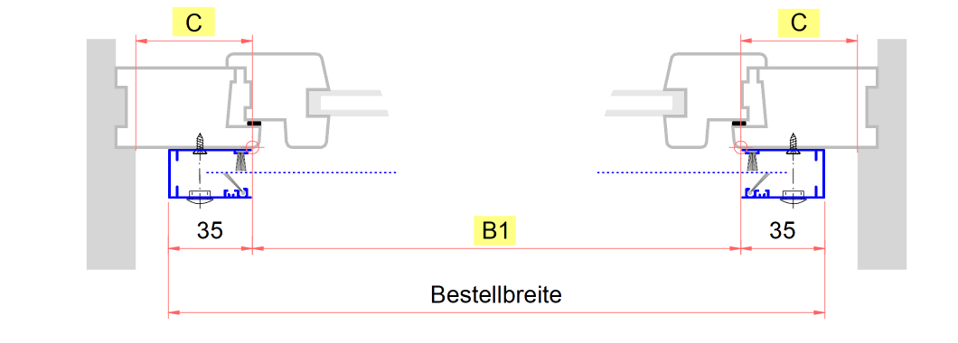 - Breite messen: Messen Sie die Breite der Rahmenöffnung, Maß B1 in der Zeichnung. Die Messpunkte beachten