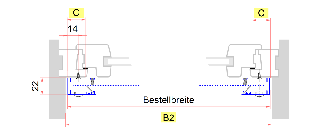 - Breite messen: Messen Sie die Breite der Rahmenöffnung, Maß B2 in der Zeichnung. Die Messpunkte beachten