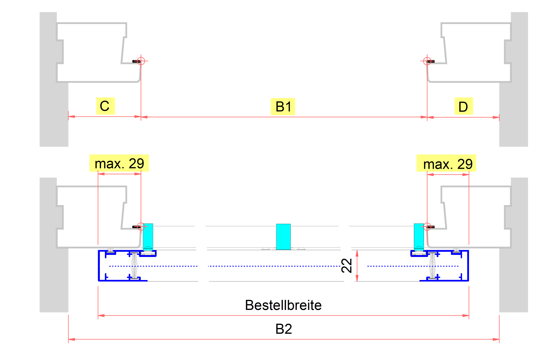 *Die Auflagebreiten rechts und links können unterschiedlich sein (z.B. Doppelfenster). Unbedingt beachten: Das Bestellmaß muss kleiner sein als das Kontrollmaß B2. Die max. Auflage pro Seite darf 2,9 cm nicht überschreiten.Beispiel: B1 = 1100 mm, C=20 mm, D=6 mm - Berechnung: 1100 + 20+ 29 mm