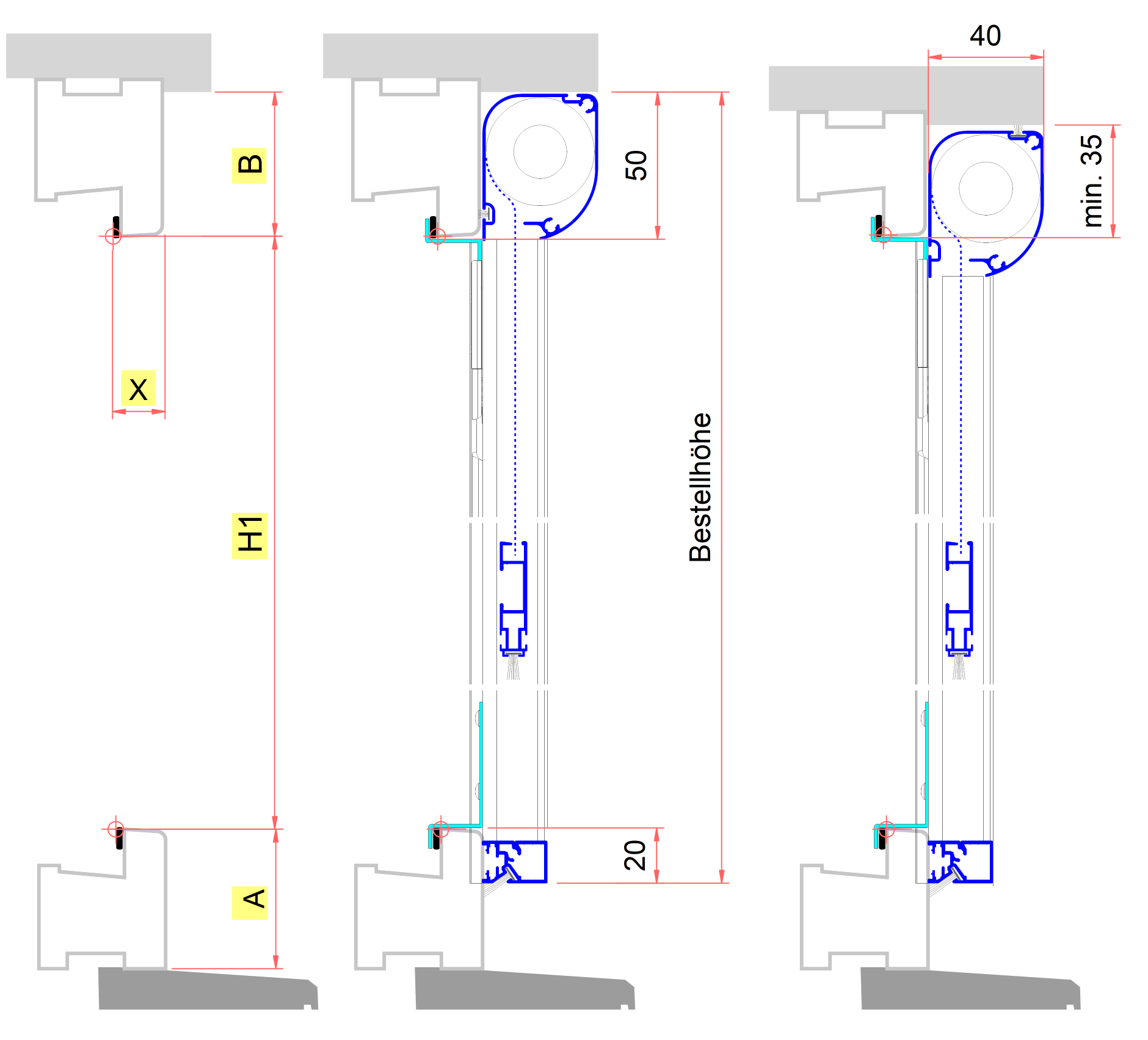 *Das Maß B sollte auch bei ausreichend Platz 5 cm nicht überschreiten, damit die Zugschiene erreichbar bleibt.