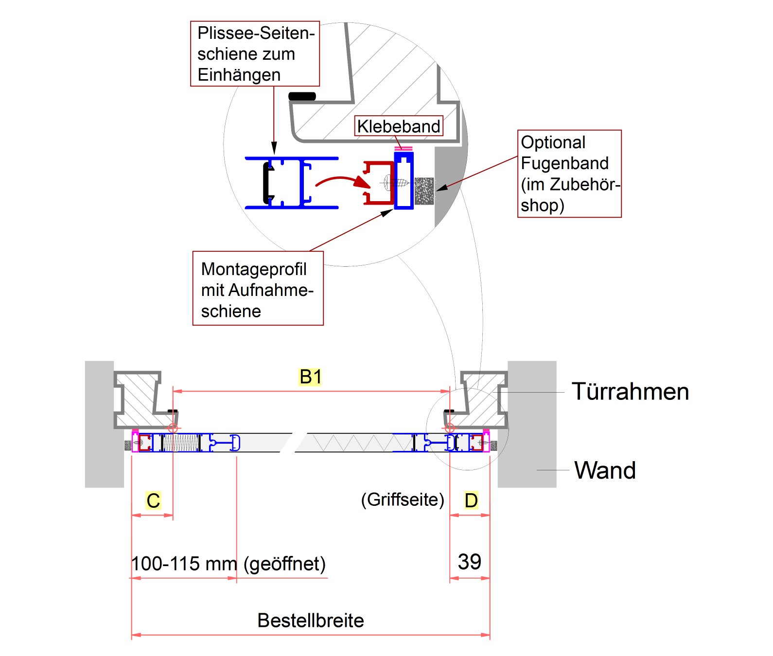 B1+ C (10 bis 100 mm) + D (10 bis 39 mm) = Bestellbreite