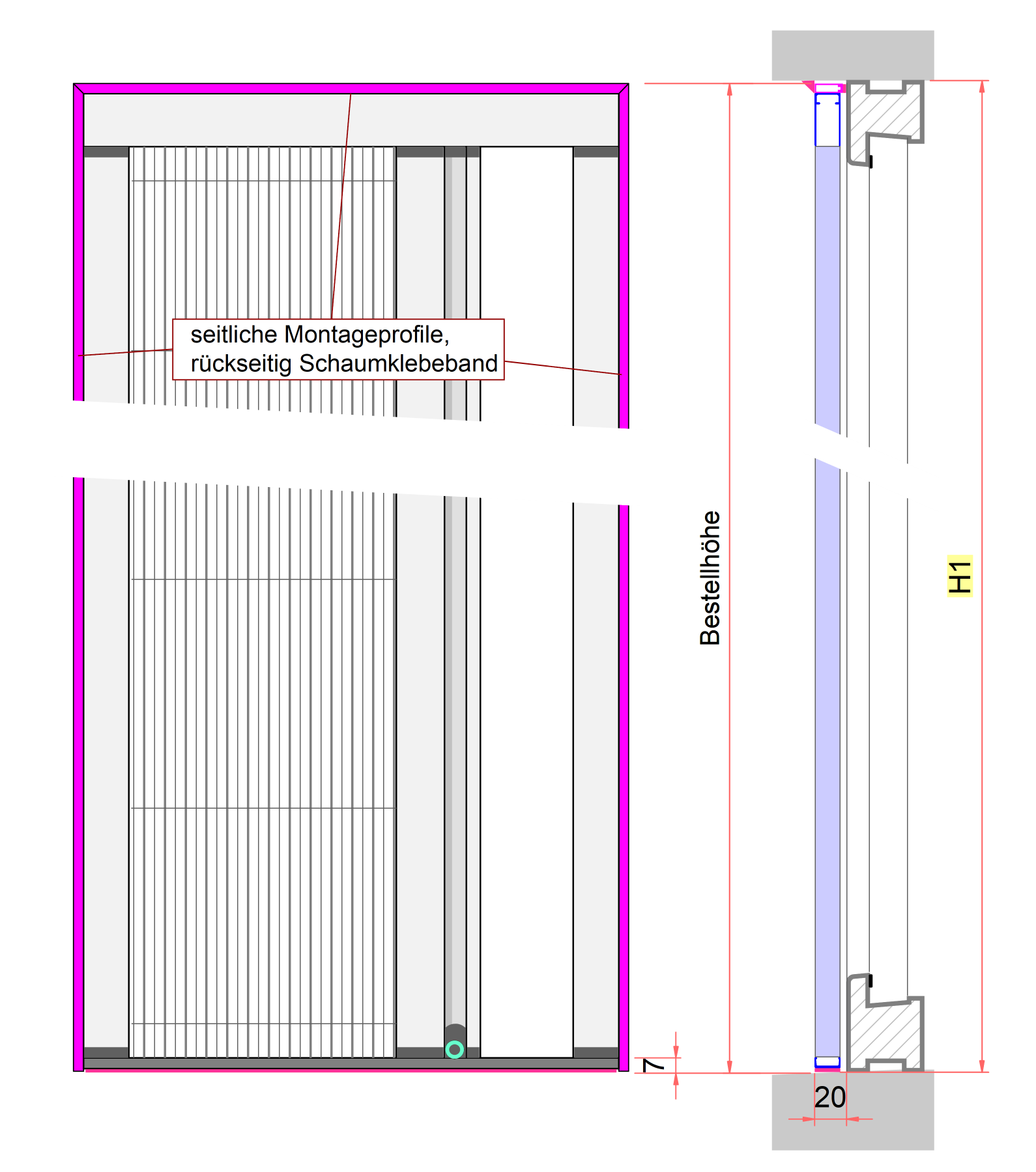 - Messen Sie die Höhe vom Laibung (Sturz und Boden), das Maß ist in der Zeichnung mit H1 angegeben. Bei Abweichungen nehmen Sie das kleinste Maß an.