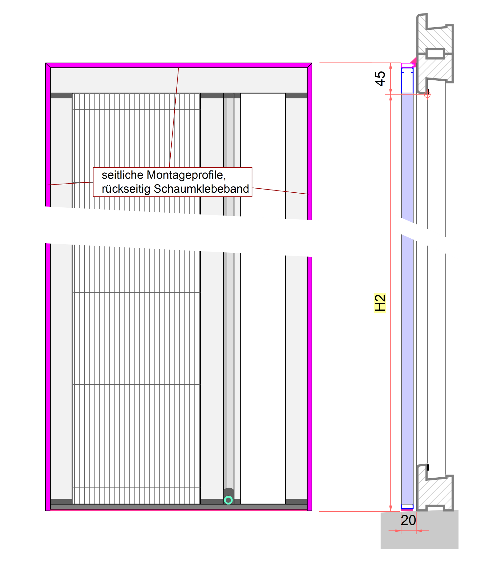 - Messen Sie die Höhe von der geplanten Oberkannte des Zusatzprofils bis zur oberen Innenkante des Türrahmens. Das Maß ist in der Zeichnung mit H3 angegeben.