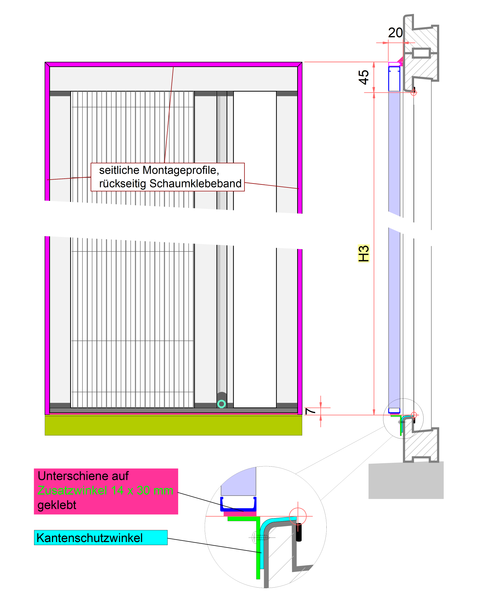 Prüfen Sie ob auf dem unteren Türrahmen genügend Auflagefläche für das Zusatzprofil vorhanden ist. Die Höhe des Zusatzprofils beträgt 30 mm.