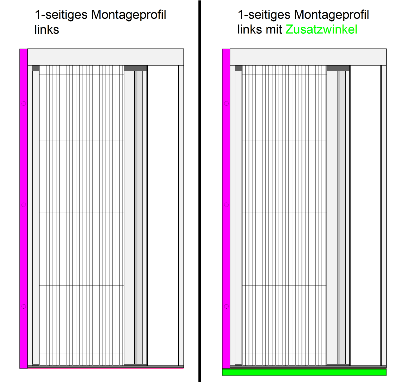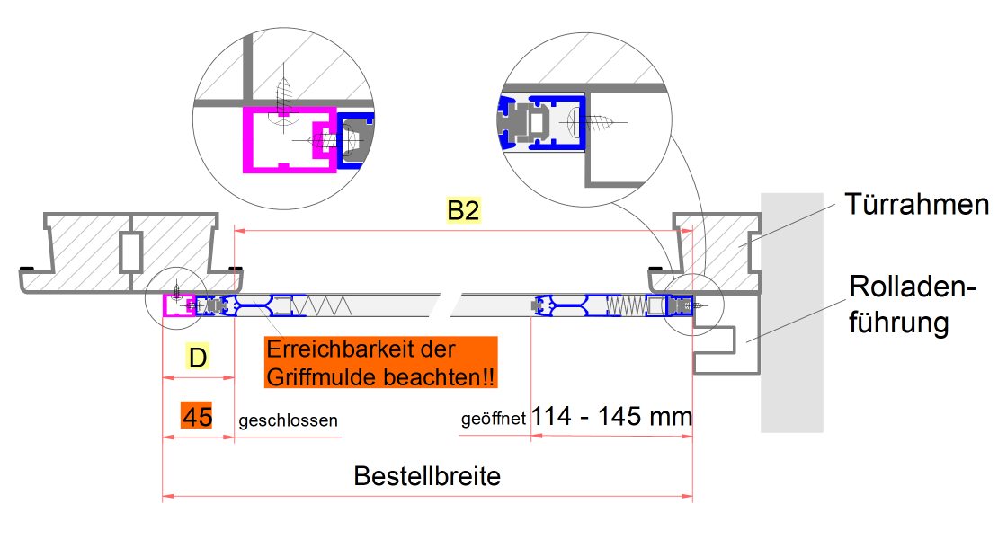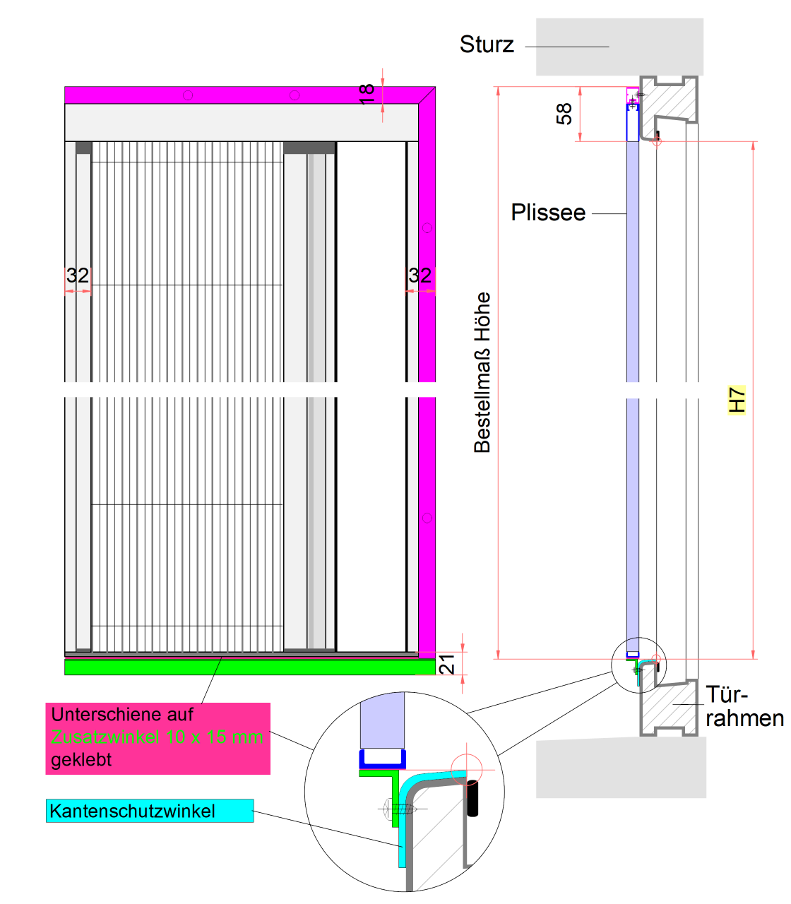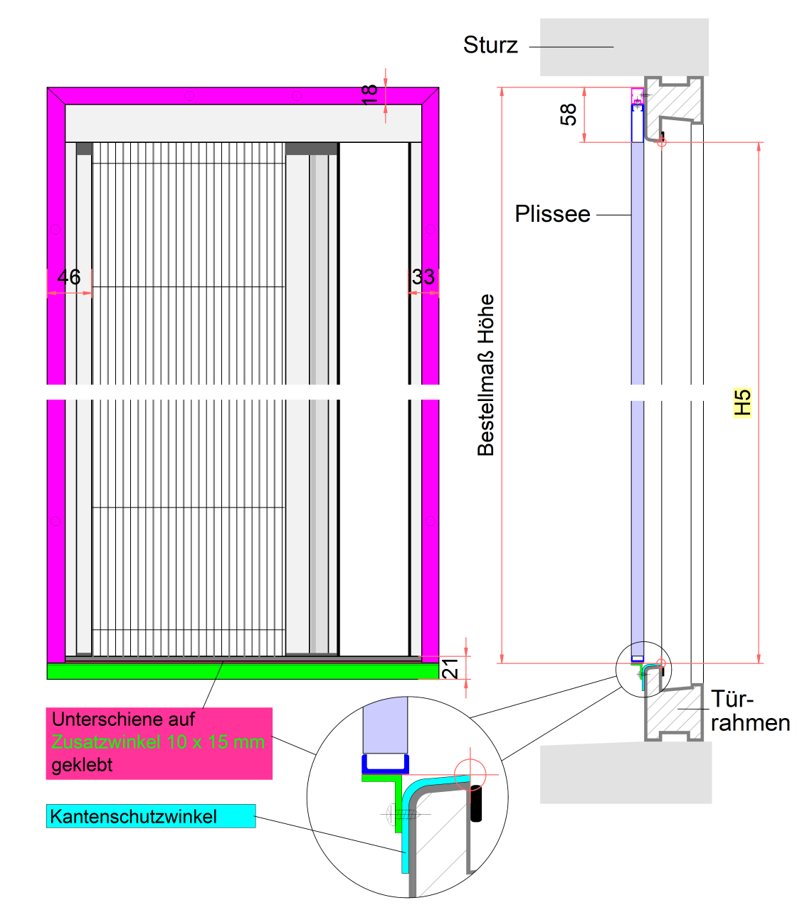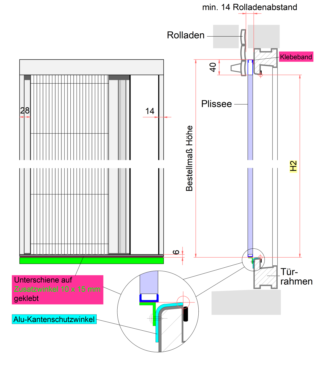 Bei manchen Türen hat man eine Alu-Kantenschutz-Schwelle, die gegenüber dem Türrahmen 3 - 5 mm vorspringt. Eine Montage vor dieser Schwelle kann dazu führen, das der Rolladenabstand nich mehr ausreicht, da der Vorsprung zu der Dicke des Plissees (13 mm) dazukommt. In diesem Fall kann ein Zusatzwinkel bestellt werden, mit dem direkt auf der Türschwelle eine um 14 mm verbreiterte Montagefläche für die Bodenschiene geschaffen wird. Bitte beachten Sie: