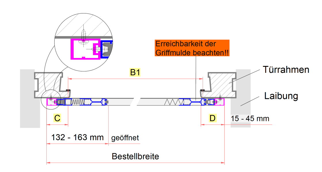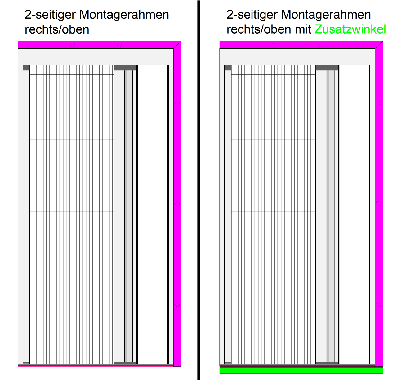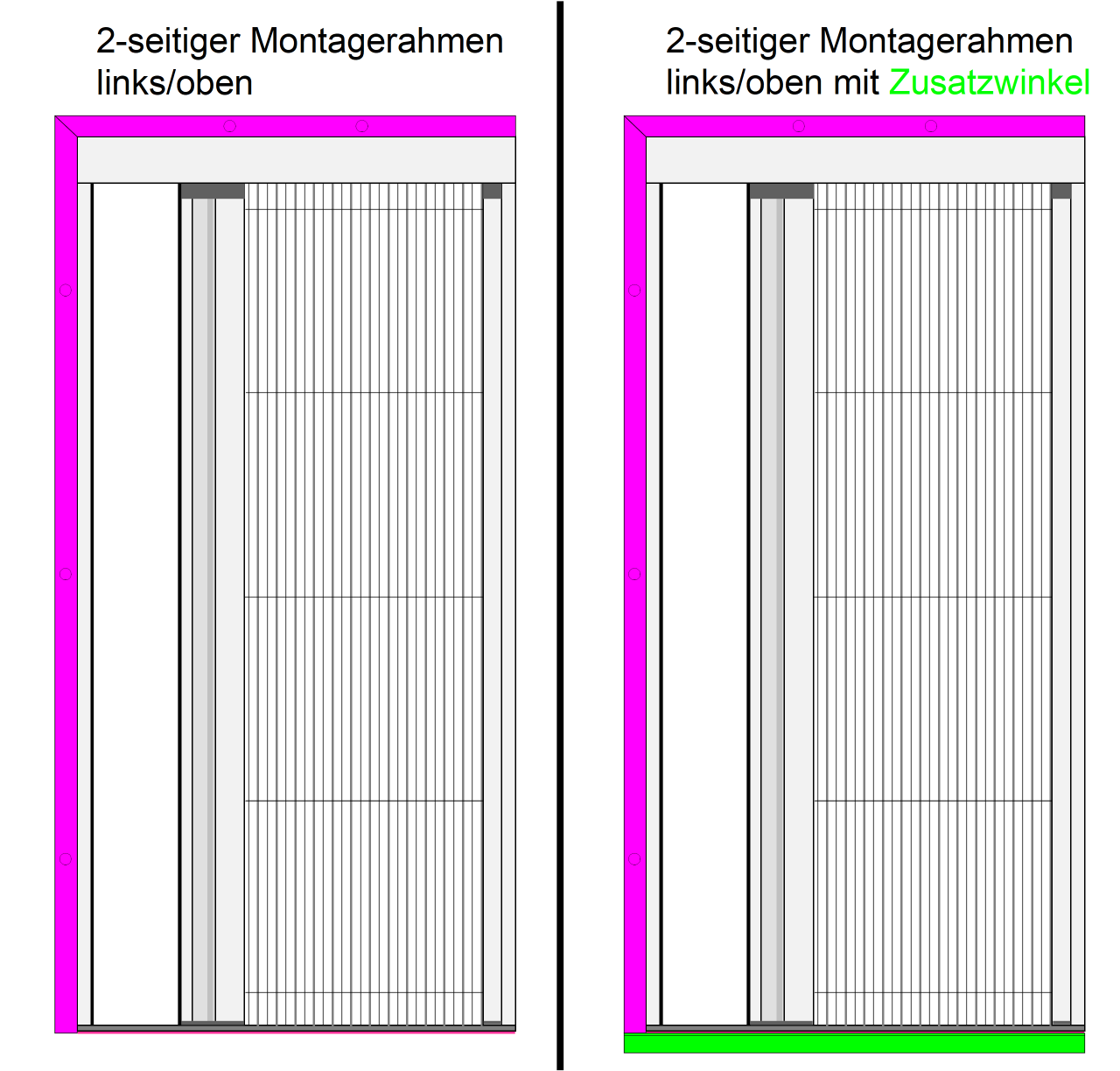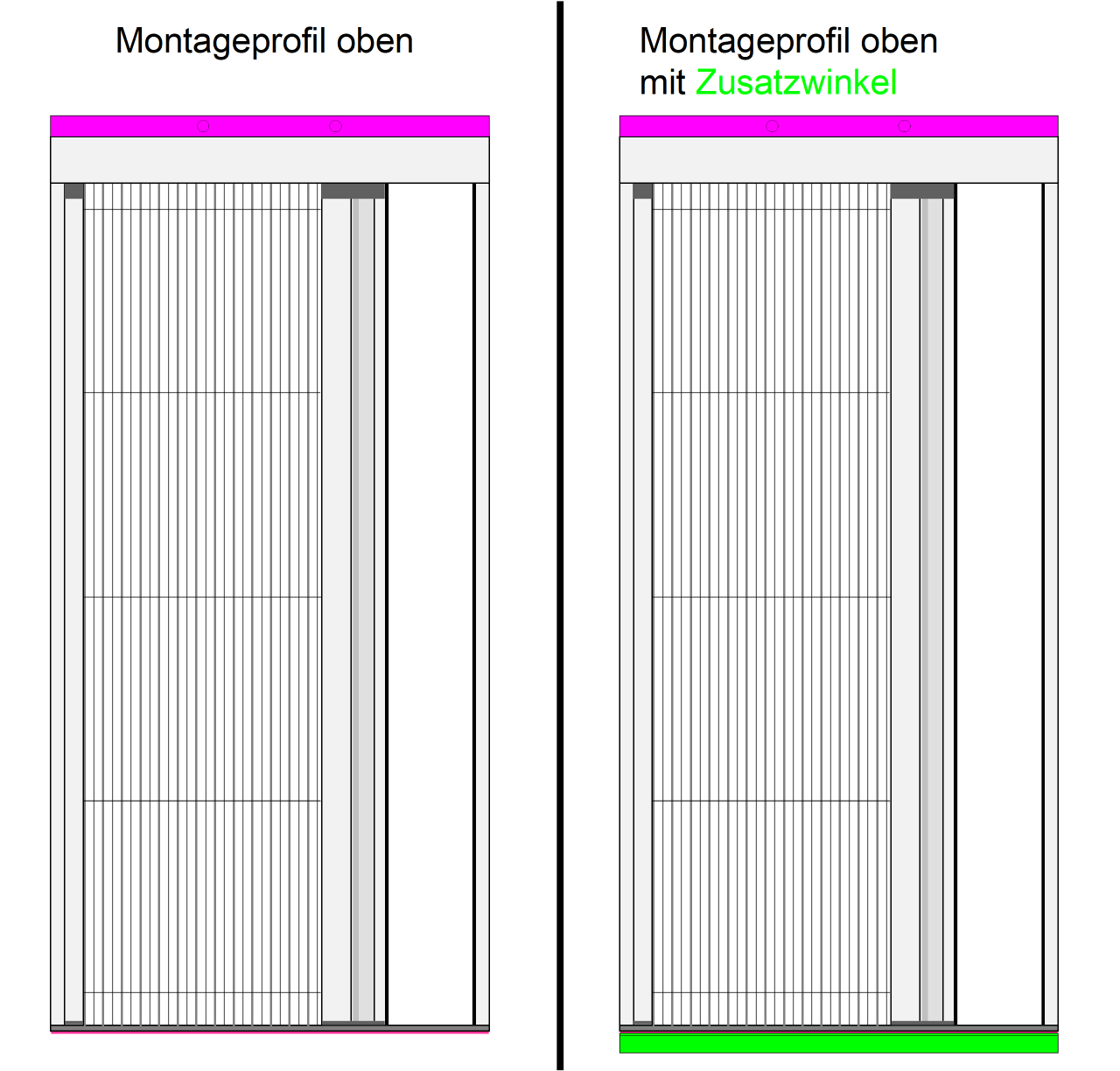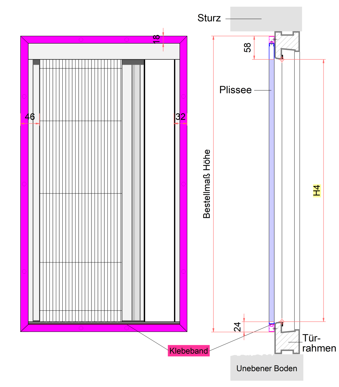 Bei manchen Türen hat man eine Alu-Kantenschutz-Schwelle, die gegenüber dem Türrahmen 3 - 5 mm vorspringt. Eine Montage vor dieser Schwelle kann dazu führen, das der Rolladenabstand nich mehr ausreicht, da der Vorsprung zu der Dicke des Plissees (13 mm) dazukommt. In diesem Fall kann ein Zusatzwinkel bestellt werden, mit dem direkt auf der Türschwelle eine um 14 mm verbreiterte Montagefläche für die Bodenschiene geschaffen wird. Bitte beachten Sie: