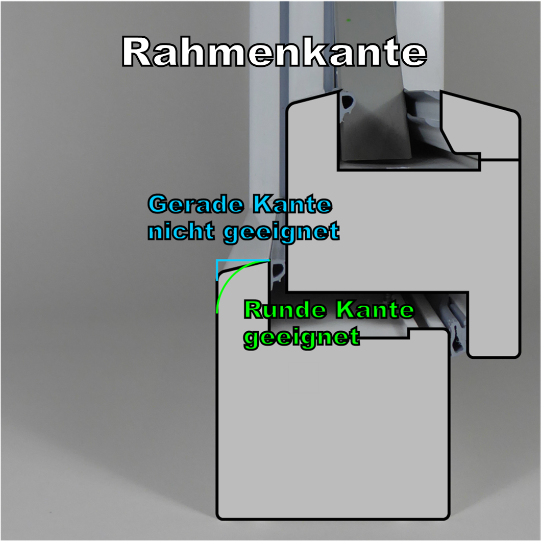 Die Form der Rahmenkante ist entscheidend für die Dichgtigkeit und die Klemmwirkung. Bei fast rechtwinkligen Rahmenkanten ist die Klemmwirkung sehr gering, bei zu schrägen oder abgerundeten Profilen liegt die Bürste nicht richtig an. Ein Abfall der Kante von nicht mehr als 3 mm auf einer Tiefe von 9 mm (gemessen inkl. Dichtung (soweit vorhanden) liegt gerade noch im möglichen Bereich.