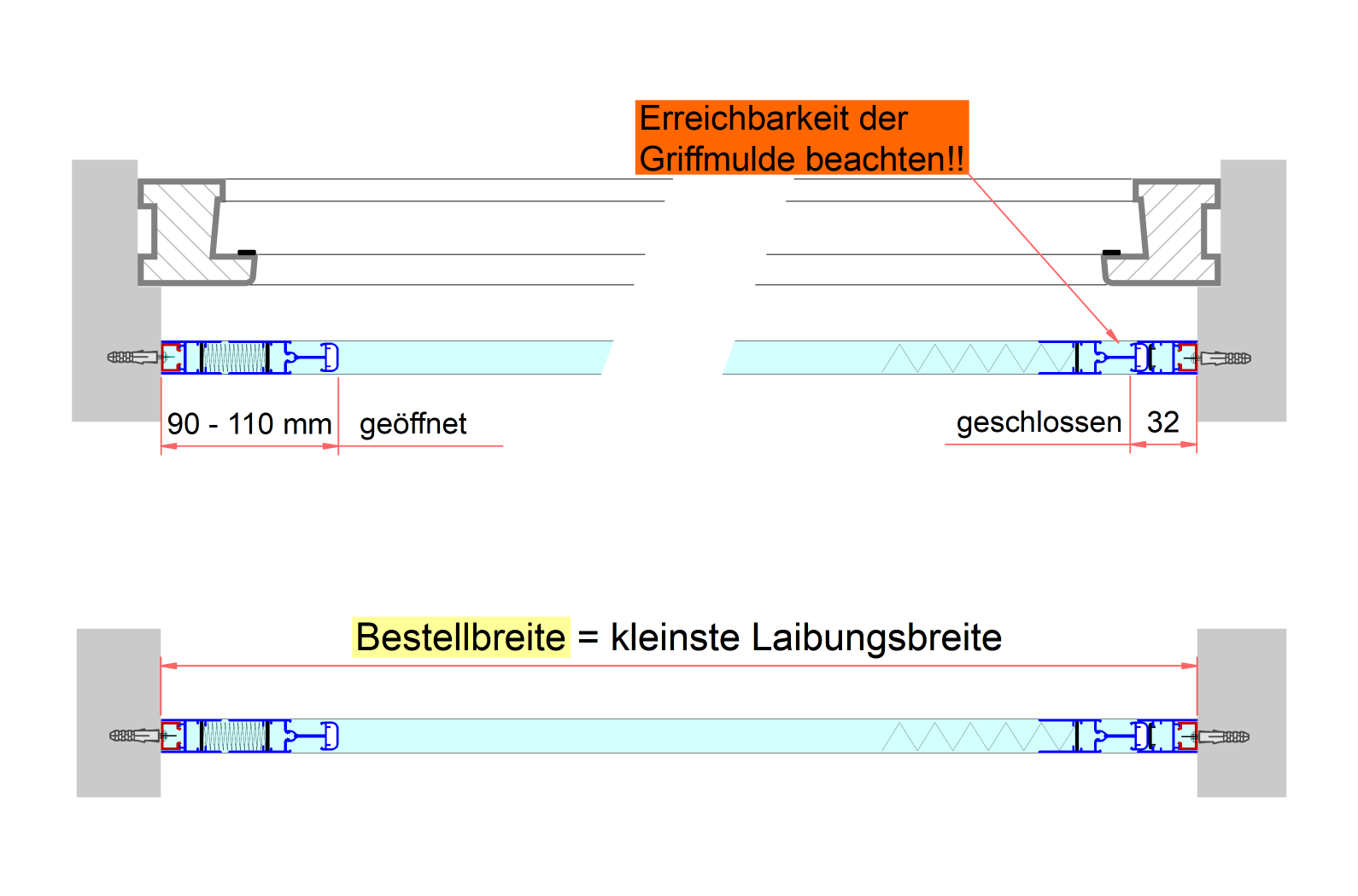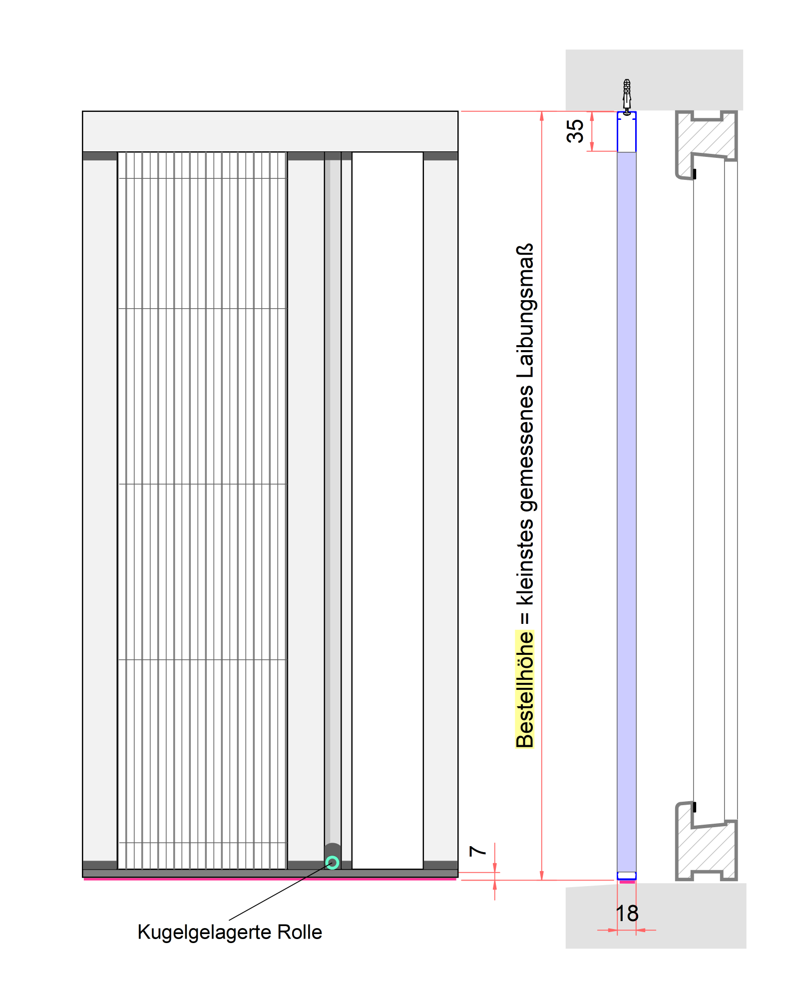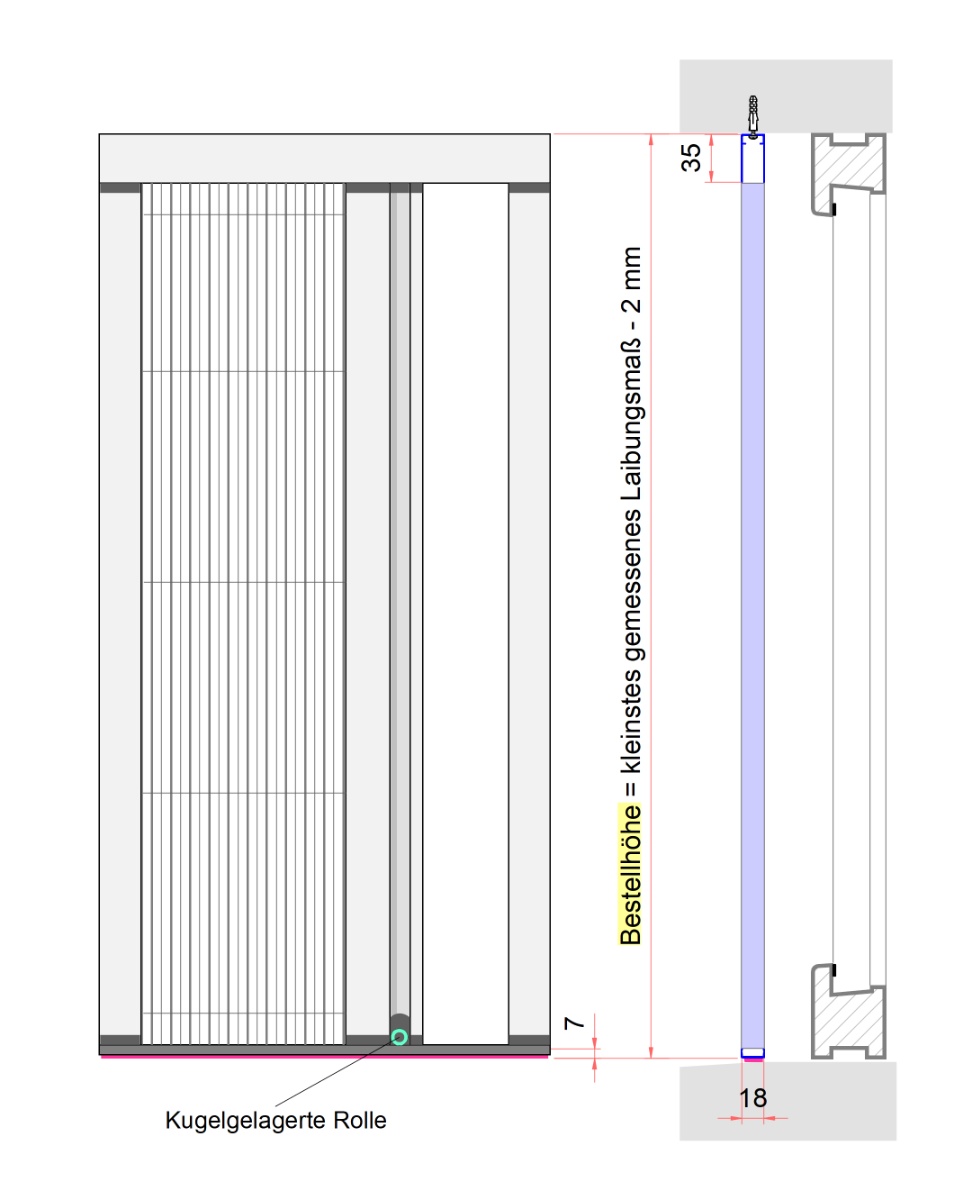 Bitte beachten: Maßabweichungen in der Leibung müssen bei der Montage durch Hinterlegen der seitlichen Schienen ausgeglichen werden. In der Breite können die Schienen nachträglich einfach gekürzt werden.