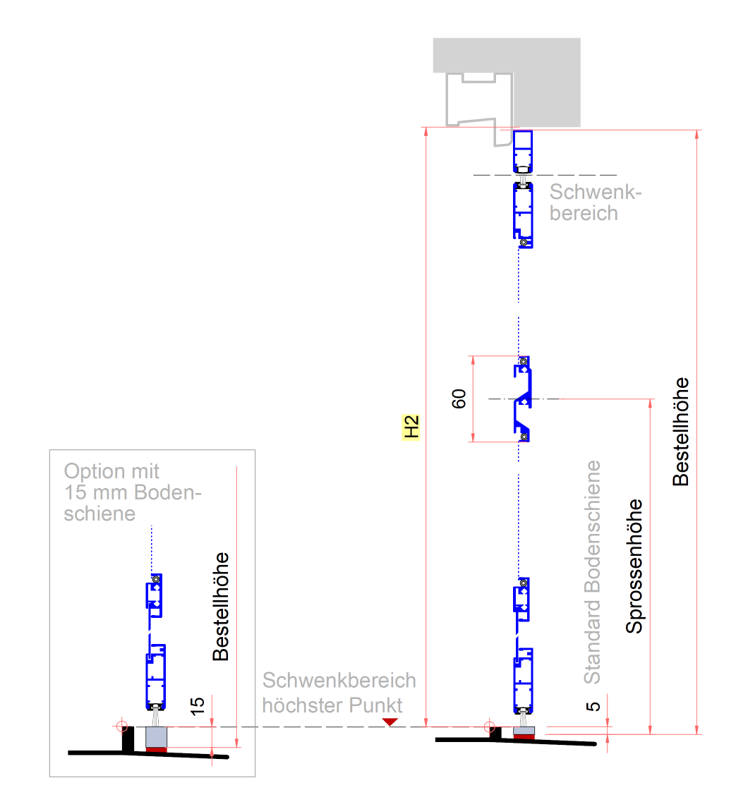 Wenn optische Gründe wichtiger sind, kann die Sprosse auch auf die Höhe evtl. vorhandener Sprossen gesetzt werden, bitte beachten das die Bestellhöhe ab Unterkante Einbaurahmen gilt!