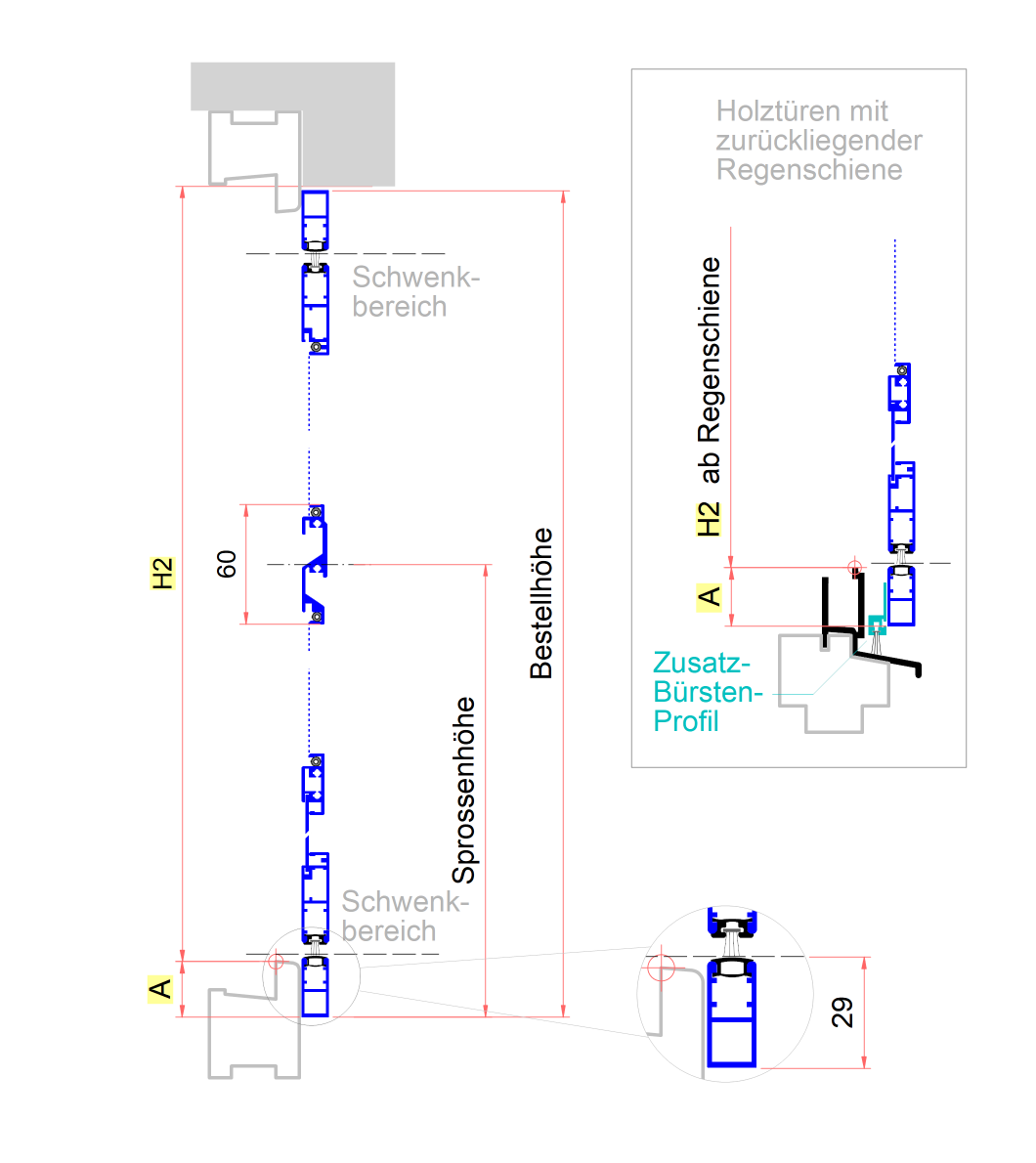 Bitte beachten, das der Bezugspunkt für diese Maße die innere Kante des Türrahmens ist, was besonders bei stark abgerundeten oder abgeschrägten Türprofilen wichtig ist. Bei Holztüren muss unten die Oberkante der Regenschiene angenommen werden!