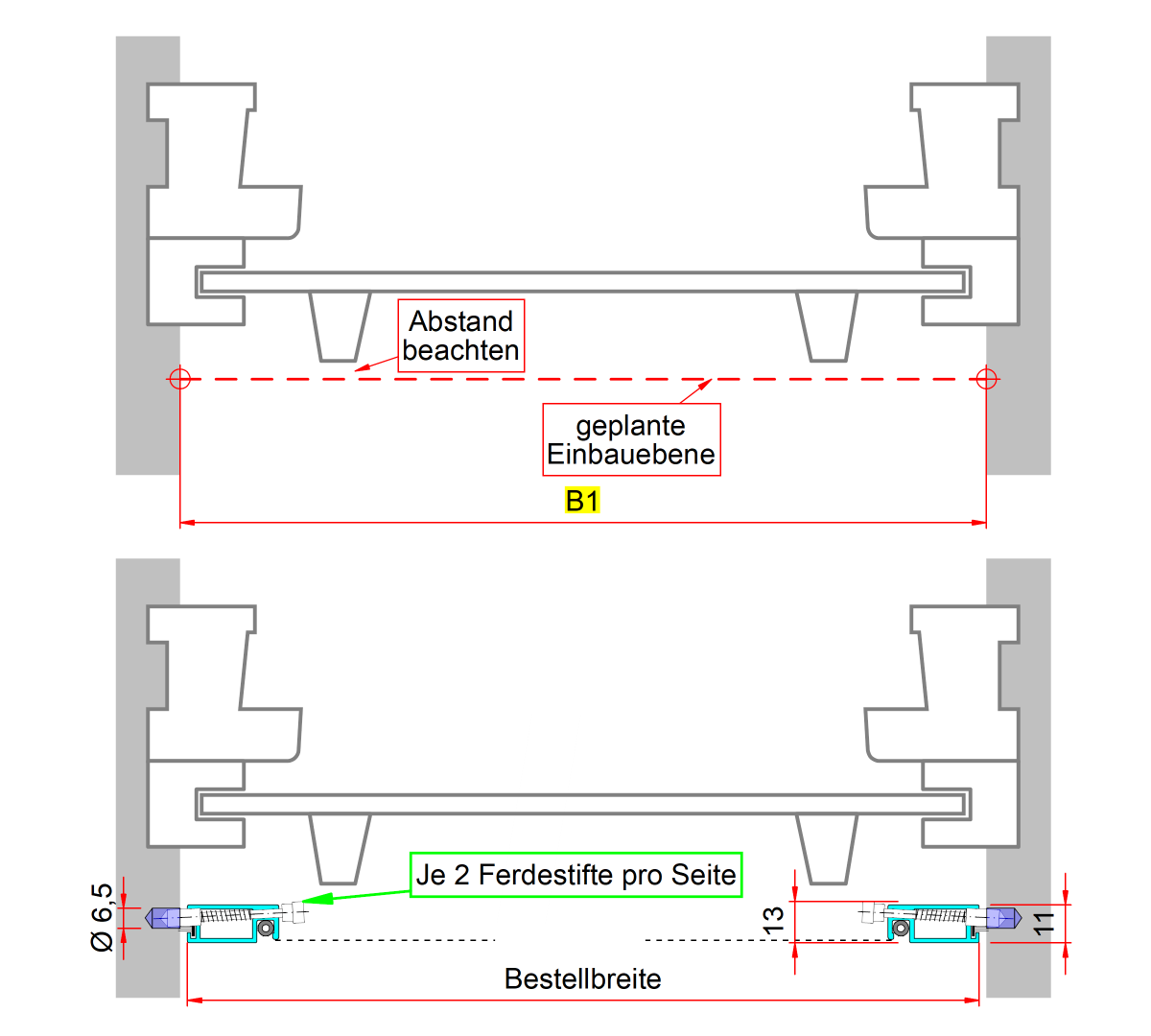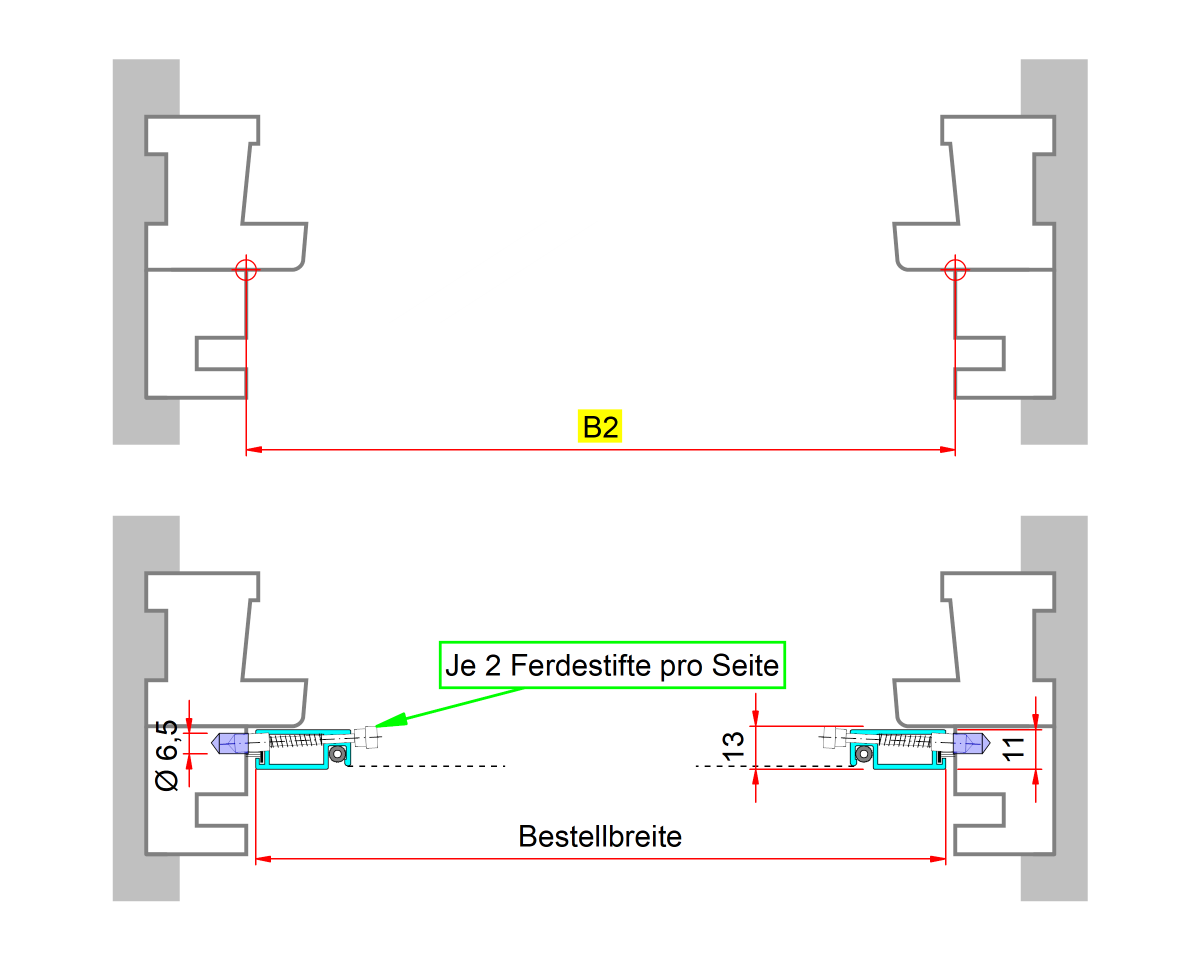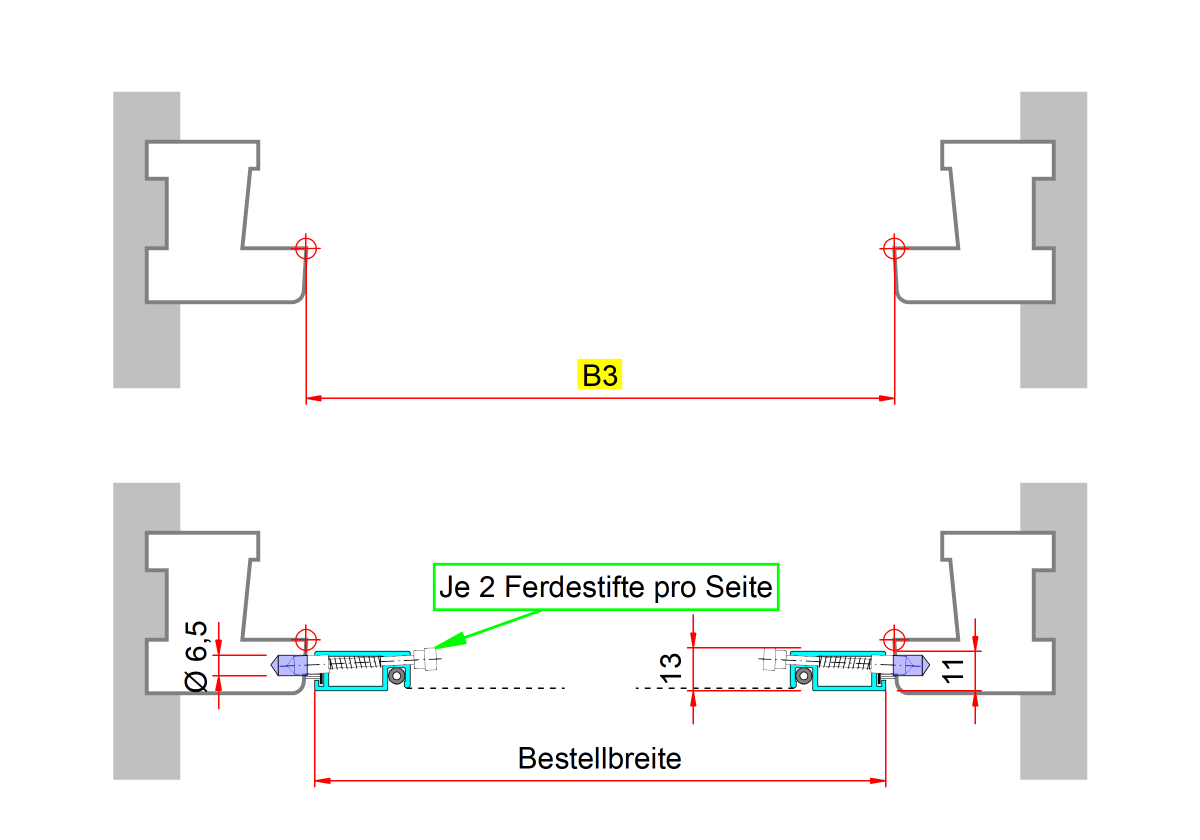 Messen Sie die Breite der Laibung an mehreren Stellen und nehmen Sie das Kleinste Maß an. Maß B1 in der Zeichnung
