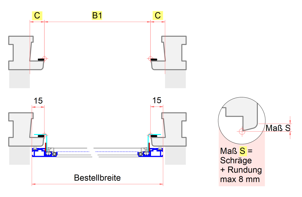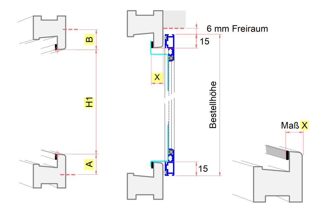 Da die seitliche Auflage mit 15 mm festgelegt ist, sollte die obere und untere auch mindestens 15 mm betragen, damit trotz der Profilkantenform der Rahmen noch ausreichend aufliegt. Bei ausreichend Platz kann in der Höhe aber ruhig etwas mehr zugerechnet werden.
