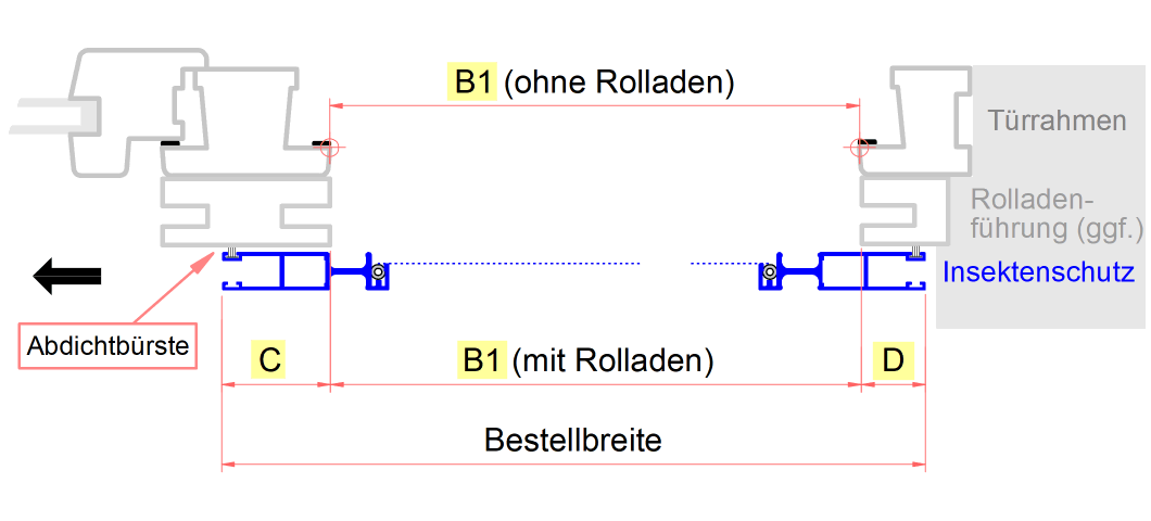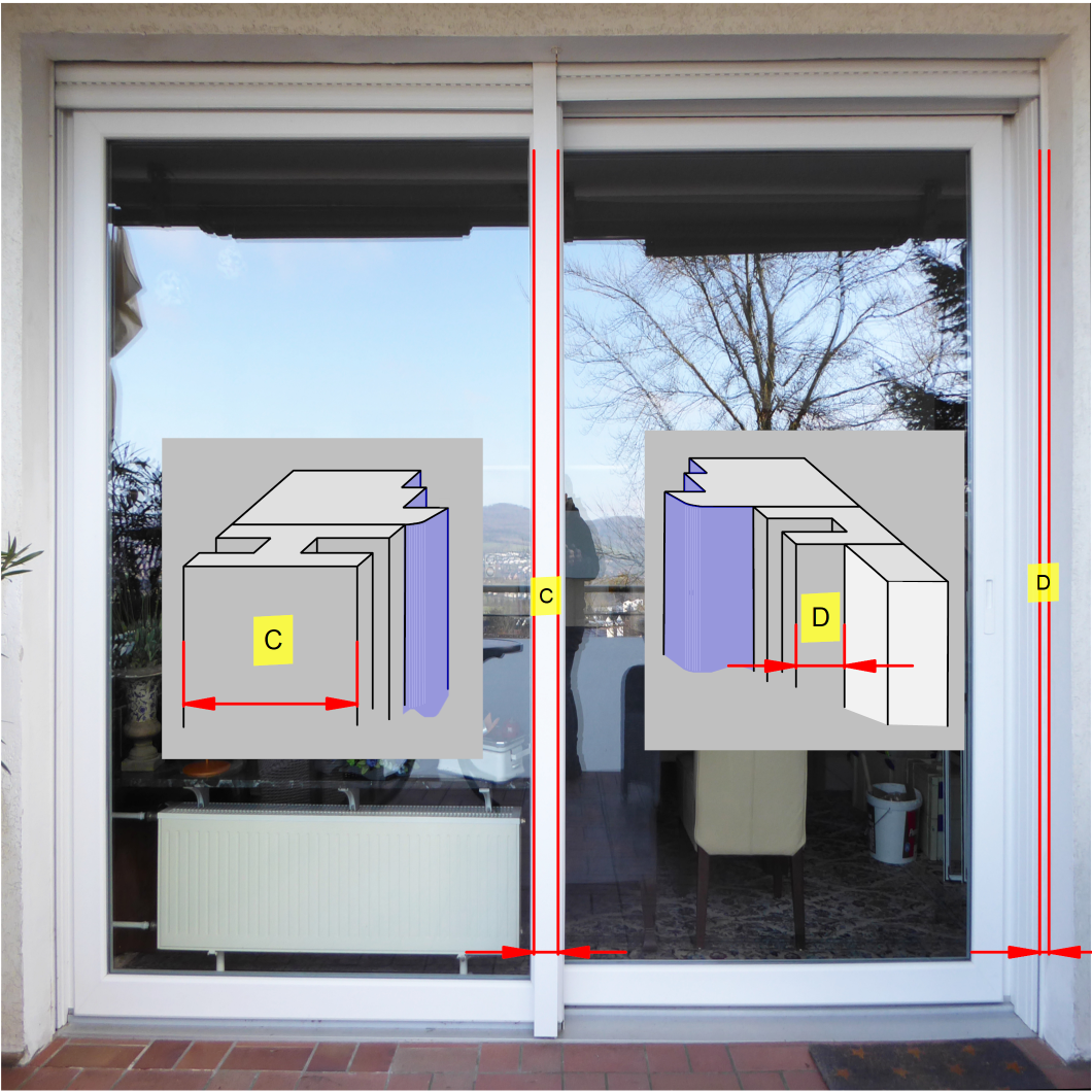 Rahmenprofile Aluminium 60 x 13,5 mm, mit durchgehender Griffmulde innen und außen. Obere Führungsschiene Winkel 43 x 20 mm, Boden-Winkelschiene 15 mm breit, 10 mm hoch. Laufrollen mit Edelstahl-Kugellagern, austauschbar, Aushängesicherung mit Hex-Schlüssel entriegelbar. Rahmen auf Gehrung mit Eckverschraubungen, Gewebe nach Wahl