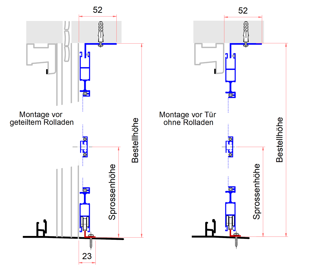 Die obere Laufscheine (Winkel 43 x 20 mm, in Rahmenfarbe) kann an 3 - 4 Punkten unter den Sturz geschraubt werden, oder auch mit Montagekleber befestigt werden.