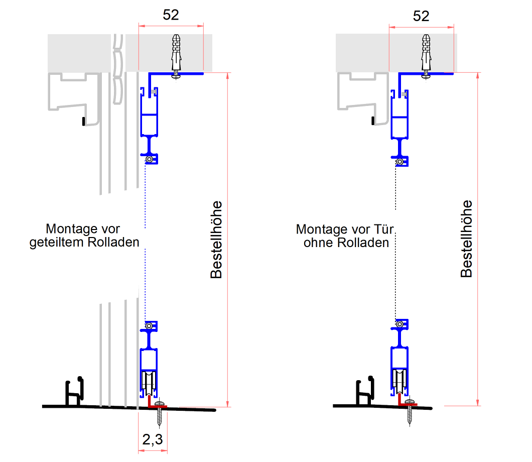 Die obere Laufscheine (Winkel 43 x 20 mm, in Rahmenfarbe) kann an 3 - 4 Punkten unter den Sturz geschraubt werden, oder auch mit Montagekleber befestigt werden.