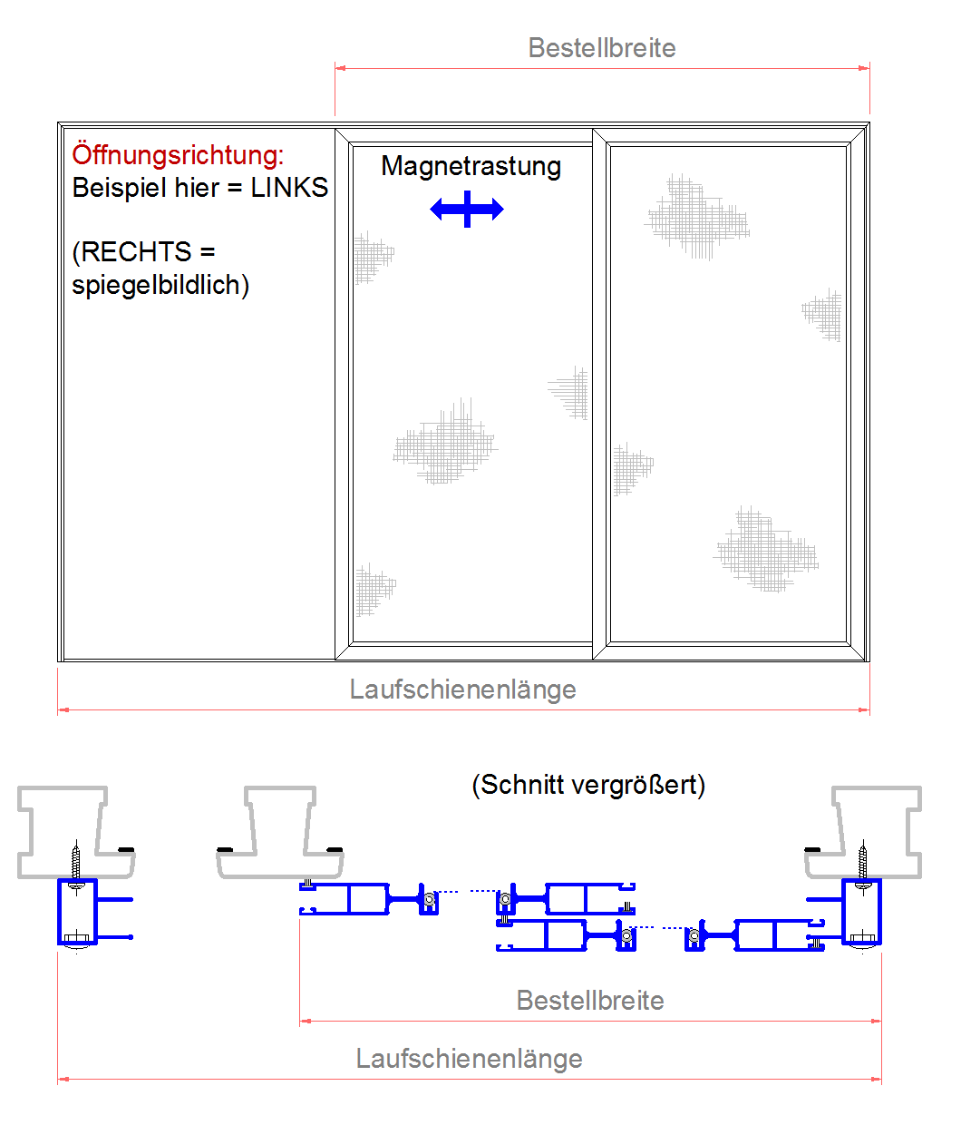 Damit der mittlere Flügel (der in der Regel meistens geschlossen ist) in seiner Position bleibt, ist dafür eine Magnetrastung vorgesehen. So wird er nicht beim Bewegen des Haupt-Durchgangsflügels mit weggezogen und kann bei Bedarf trotzdem zu jeder Seite verschoben werden.