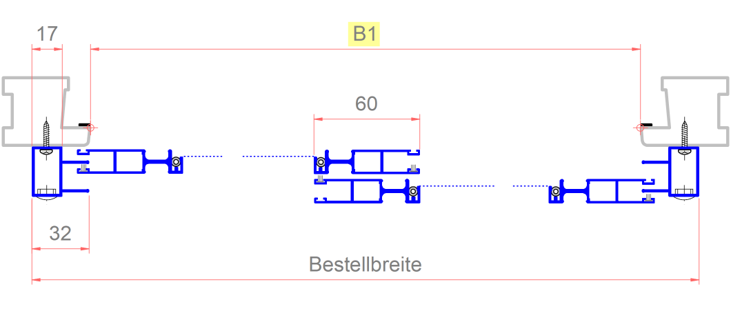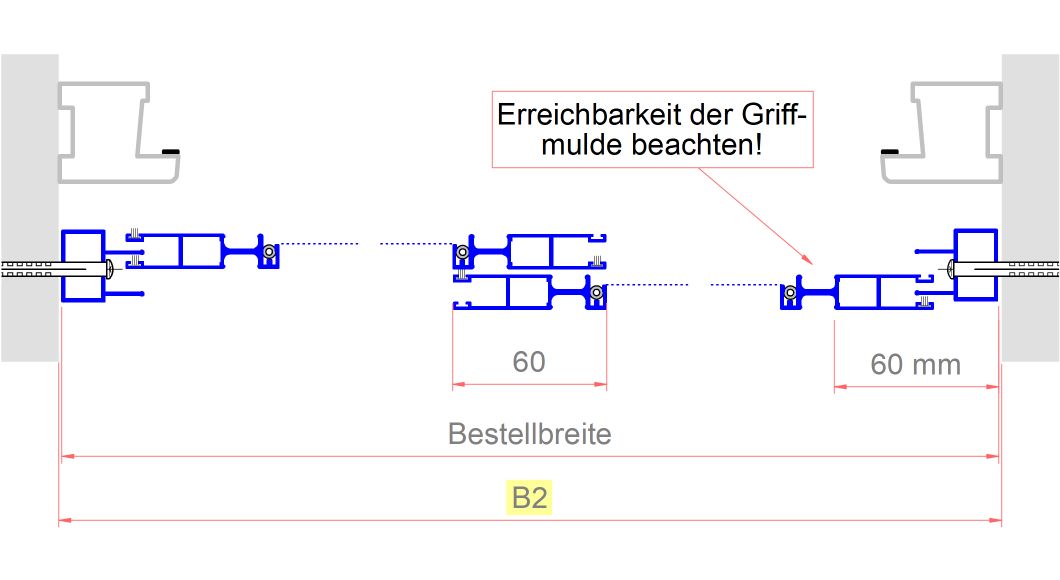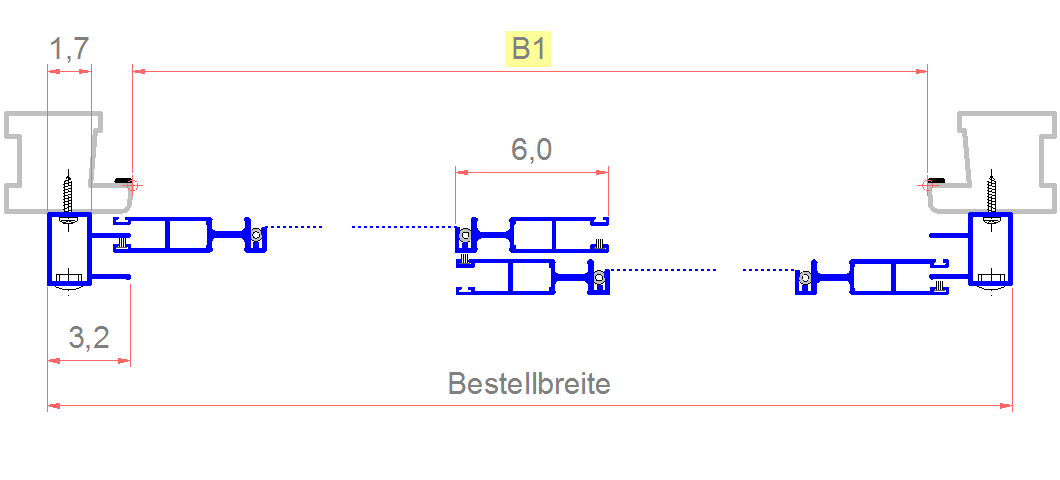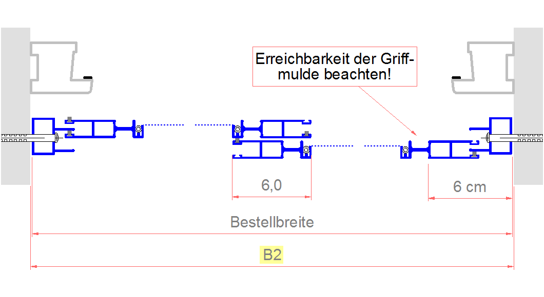 B1 + 60 mm (mind. 40 mm)= Bestellmaß Breite (Rahmenmontage)