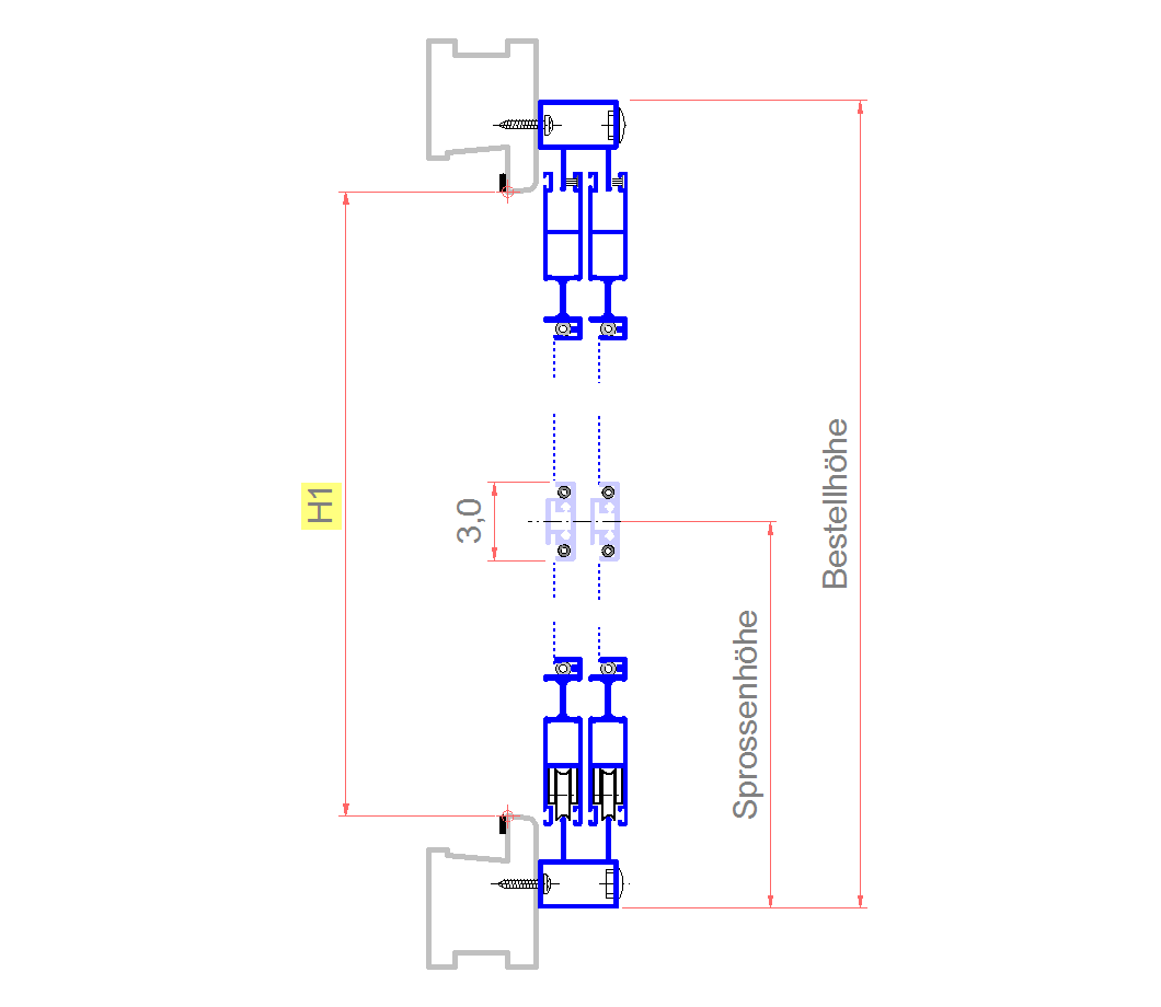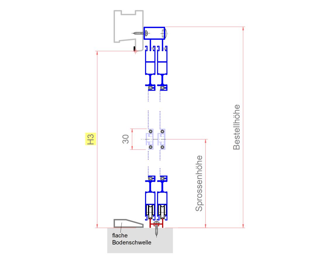 H3 + 30 mm (mind. 20 mm) = Bestellmaß Höhe (Rahmenmontage)